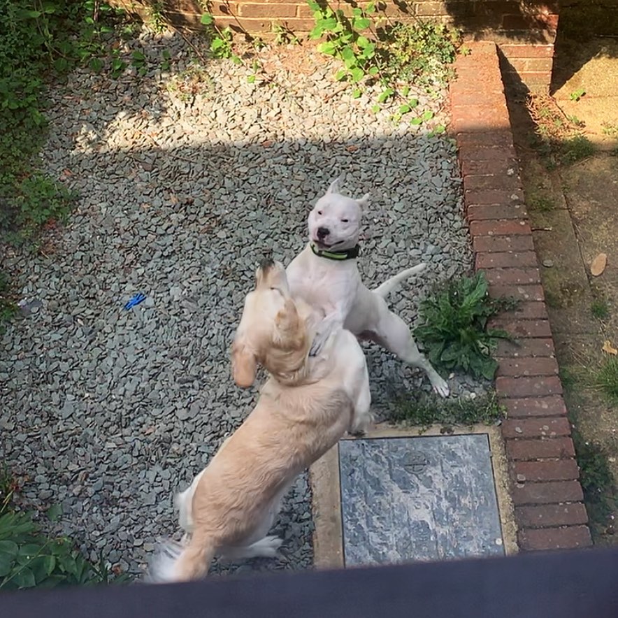 ▼看到這對「羅密歐與朱麗葉」如此苦情,Amber 與鄰居都非常不忍,如今他們也讓兩隻狗狗可以有更多一起玩的機會,至於日後牠們會如何發展就順其自然了!