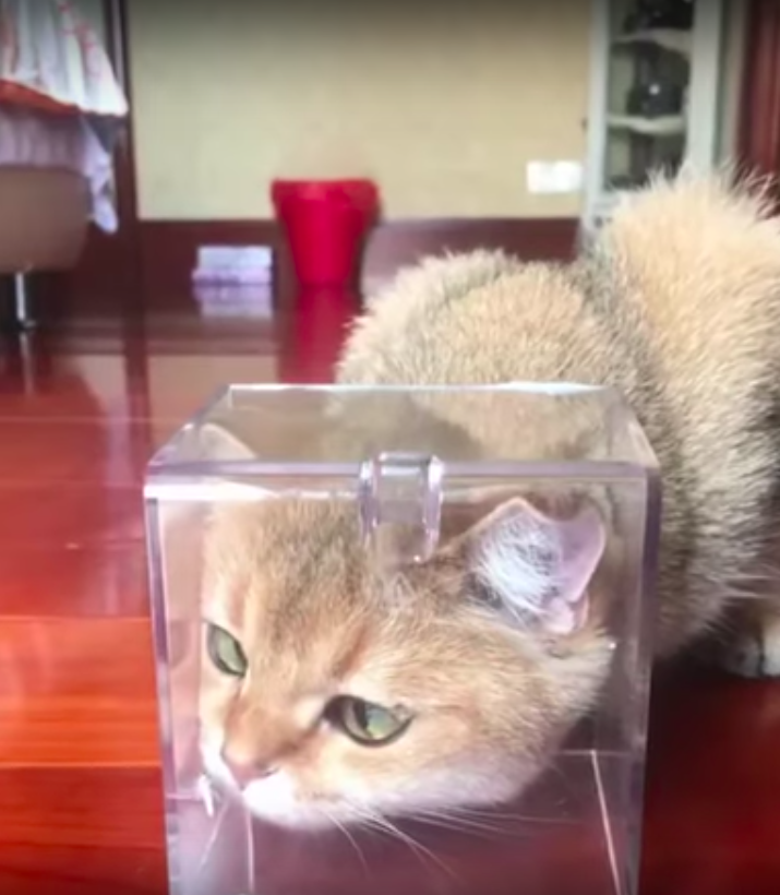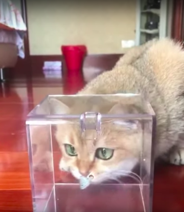 養貓的人都知道,與其給貓主子買一大堆玩具,不如給牠準備一個紙箱。貓咪超愛把自己塞進各種各樣的容器裡,看起來超可愛。下面這隻貓咪被一個壓克力盒子吸引,但牠把頭探進盒子中後,卻有點傻眼…