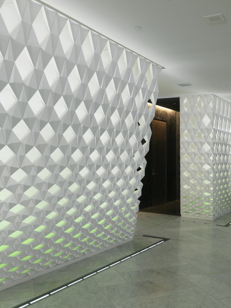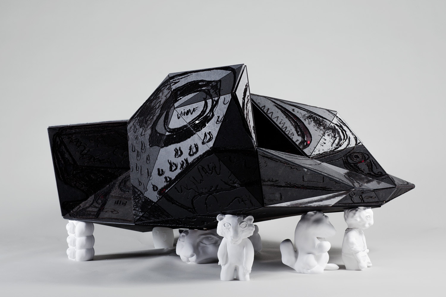 ▼底座是白色的動物雕塑,建築的上半部分就像懸浮在空中,上面有藝術家的畫作,在燈光的照射下顯得很神秘。
