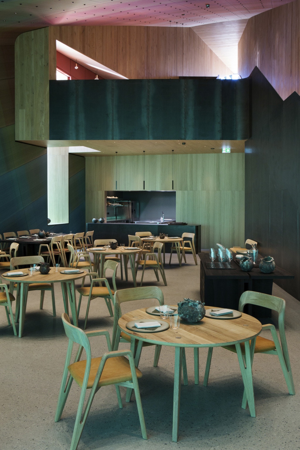 ▼室內的木製座位被打造成岩石風蝕後的不規則形狀,與室外的自然風光相呼應,一點也不會突兀。