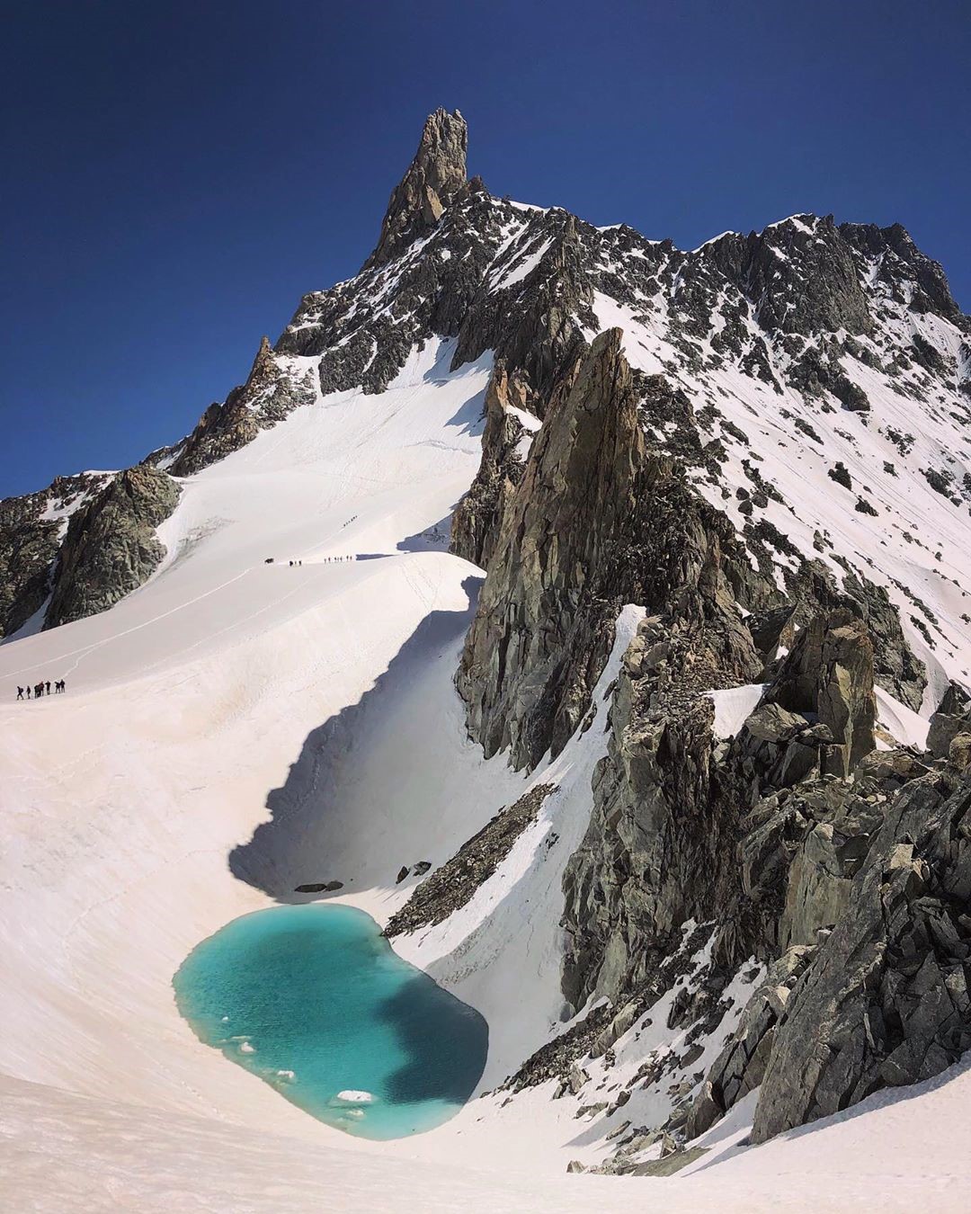 ▼而這名登山者布萊恩(Bryan Mestre)在攀登勃朗峰時,在海拔約11100英呎(約3352.8公尺)處發現了這個絕美的湖泊。雖然這裡的風景非常漂亮,可是布萊恩卻一點也沒有高興的感覺,因為這個湖泊在10天前,根本還是不存在的!