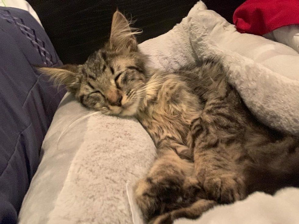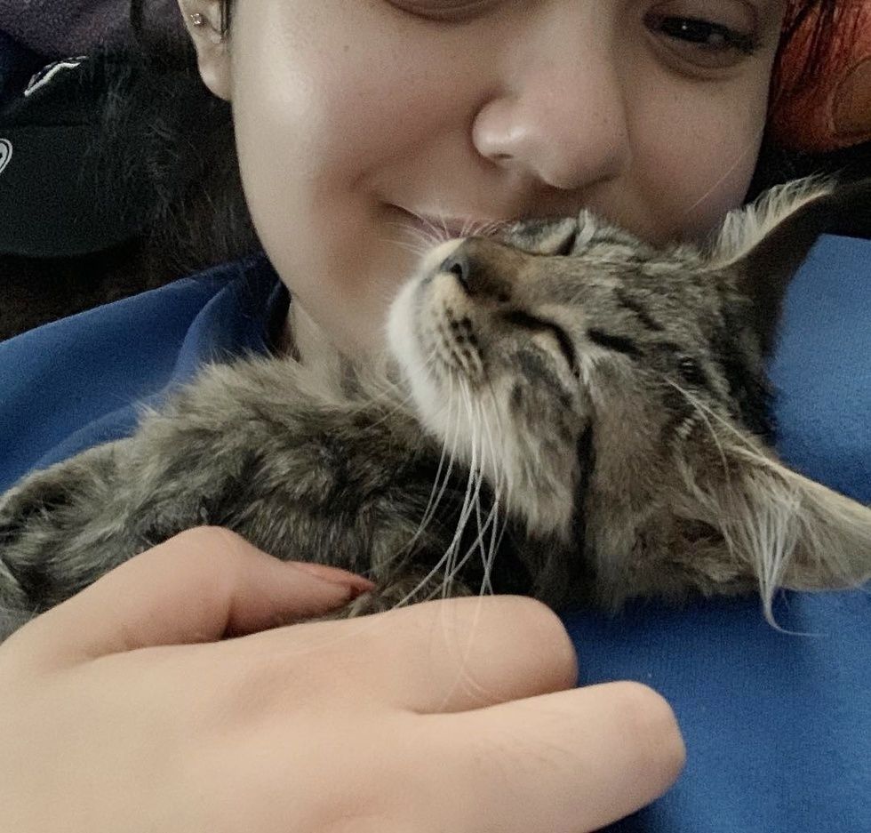 ▼貓咪蜷縮在Kiara的懷裡,貪戀這溫暖又安全的懷抱。Kiara捨不得看牠繼續在街頭流浪,於是給男友打電話,兩人帶著貓咪去寵物用品店,給牠買生活必需品。回家後他們給貓咪洗澡,又給牠準備食物,吃飽喝足後,貓咪在床上舒服睡了過去。