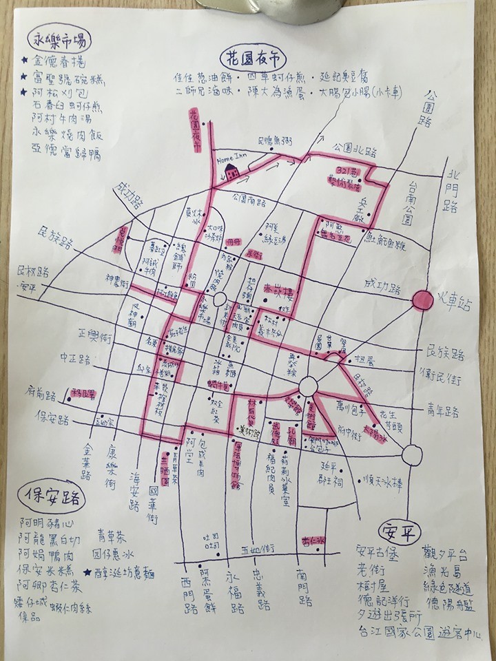 ▼從這張地圖可以看到,作者將整個台南市區都畫成了線狀圖,不僅列出了各地的美食位置,還將重點地方用粉紅色的螢光筆註記了起來。還畫有「永樂市場」、「花園夜市」、「保安路」的重點美食,例如永樂市場就要去吃金德春捲、富盛號碗糕,保安路則有阿明豬心、醇涎坊意麵等等。