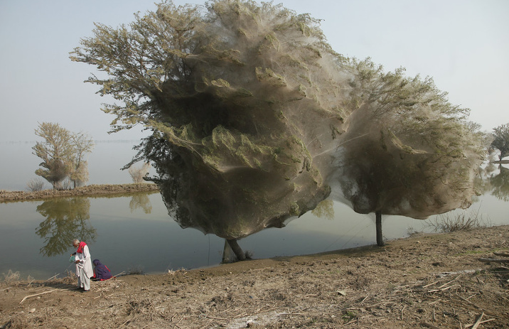 ▼一整排的樹都被蜘蛛絲包覆!