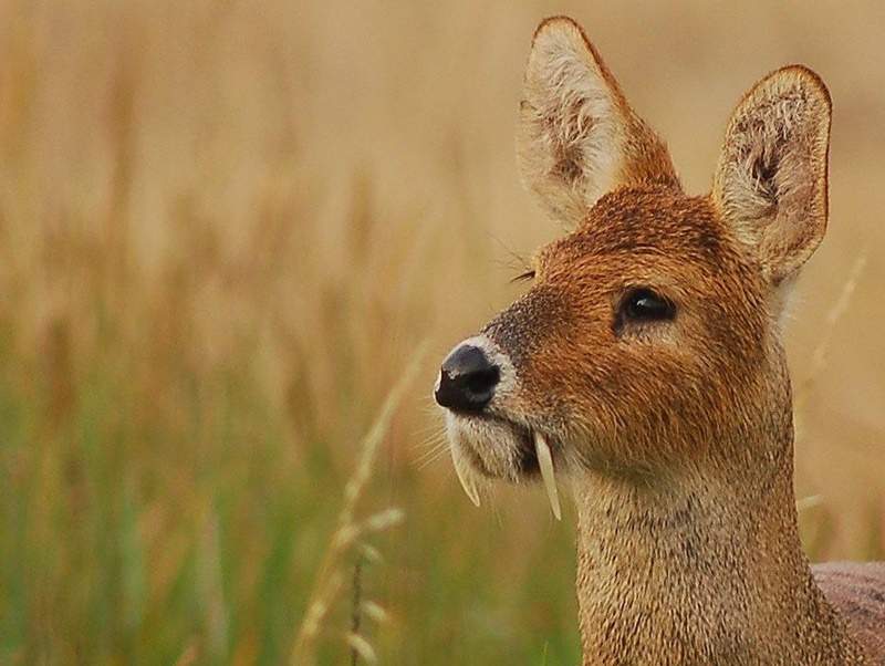 ▼獐:這種動物也被稱為「水鹿」,雖然長有尖牙,但牠們與其他種類的鹿差不多,都是草食性動物,以吃草為主。