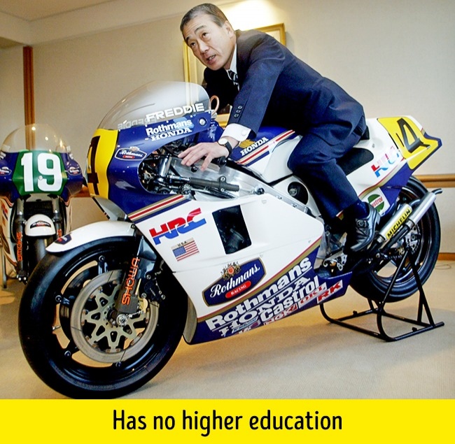 ▼本田宗一郎(Soichiro Honda)-低學歷:他出生於一個貧困的家庭,從小就要工作賺錢。畢業後他成為了一名機械工人,試著在自行車上安裝舊引擎,還夢想用昂貴的材料來製造自己的機車。後來他成立本田公司,現在這已經是世界知名的汽車和機車公司了。