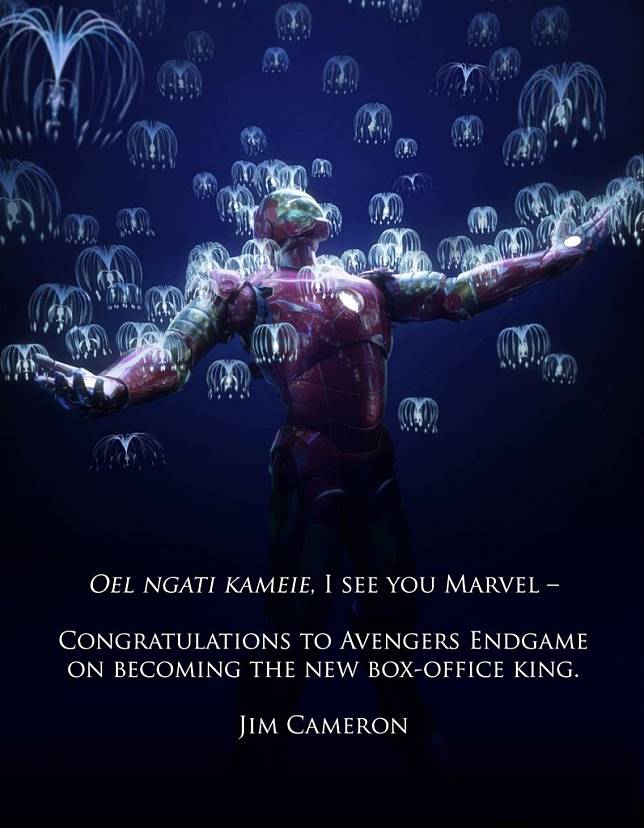 ▼卡梅隆在圖片中用納美語寫道:「Oel Ngati Kameie ,我看見了你,Marvel -恭喜《復仇者聯盟4》成為新任的影史全球票房之王。」
