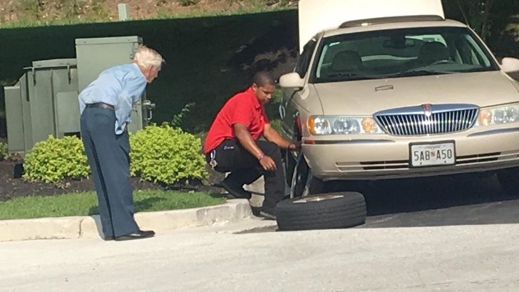 ▼這位速食店的員工正在幫一位二戰老兵換輪胎。