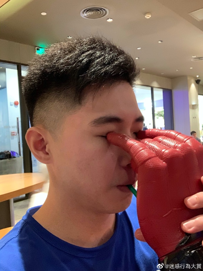 ▼微博粉專「迷惑行為大賞」貼出4張照片,一名網友在電影院買了蜘蛛人主題的可樂杯,杯子是蜘蛛人射出蜘蛛絲的經典手勢,看起來非常帥氣。