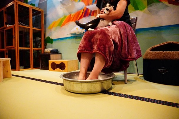 ▼消費者也可以額外付費享受泡足湯的服務,一面泡腳一面抱著貓咪,真是身心靈都被療癒了!