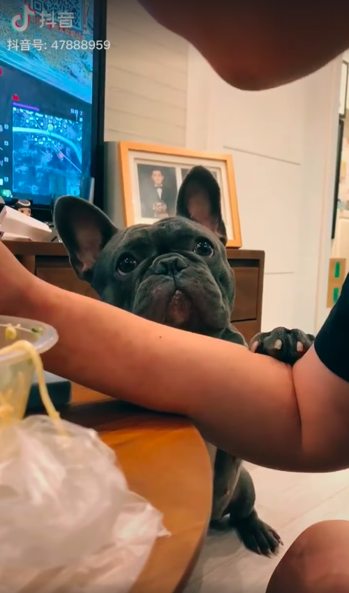 2019年08月07日狗狗都很貪吃,只要看到主人手中拿著食物,就想討來吃一點。一名網友家中有一隻黑溜溜的法鬥,那天主人吃飯時,狗狗各種撒嬌,希望主人分自己吃一口。牠可愛的表現讓人心都融化了。