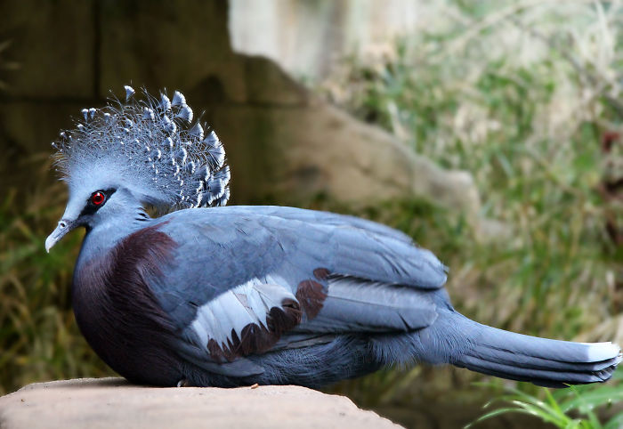 ▼維多利亞鳳冠鳩長著宛如皇冠一般的冠羽,胸部的羽毛呈暗紫紅色,紅色的眼睛周圍還有黑色的「眼線」,腳上穿著「網襪」,簡直是走在時尚前沿的鳥界明星。