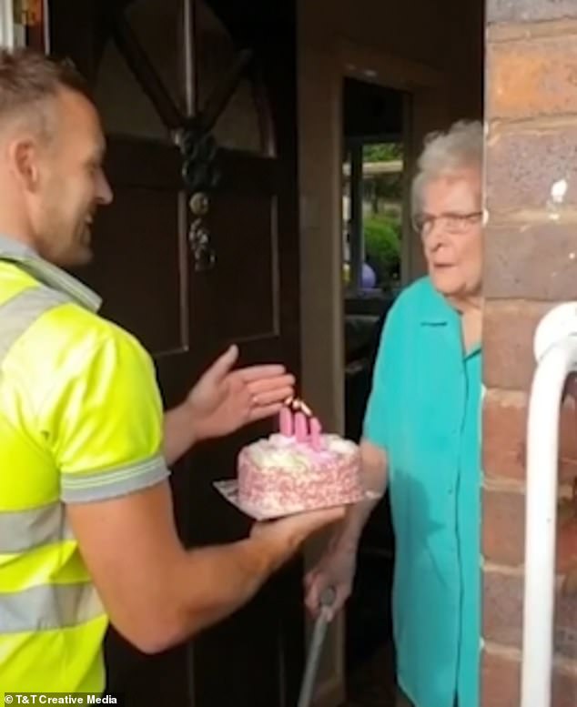 ▼原來當地的資源回收工作人員在她生日當天,為他們最喜歡的這位「好客戶」準備了一個驚喜!他們捧著蛋糕,來到了 Mercy 家門口按門鈴,並且耐心的等待她開門。