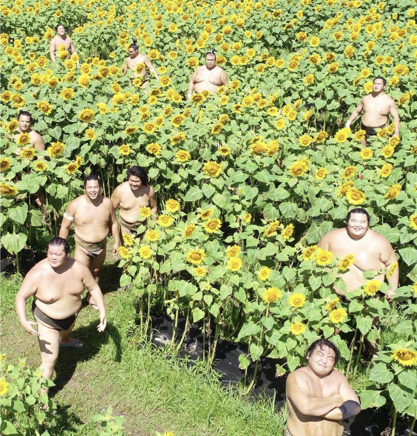 2019年08月15日當相撲力士遇上向日葵花田,畫面居然無違和感?!日本大相撲芝田山部屋在進行夏日集訓時,場地附近有一大片的向日葵花田,於是他們就趁著休息時間去欣賞美景,還玩很嗨地對著鏡頭擺姿勢拍大合照!