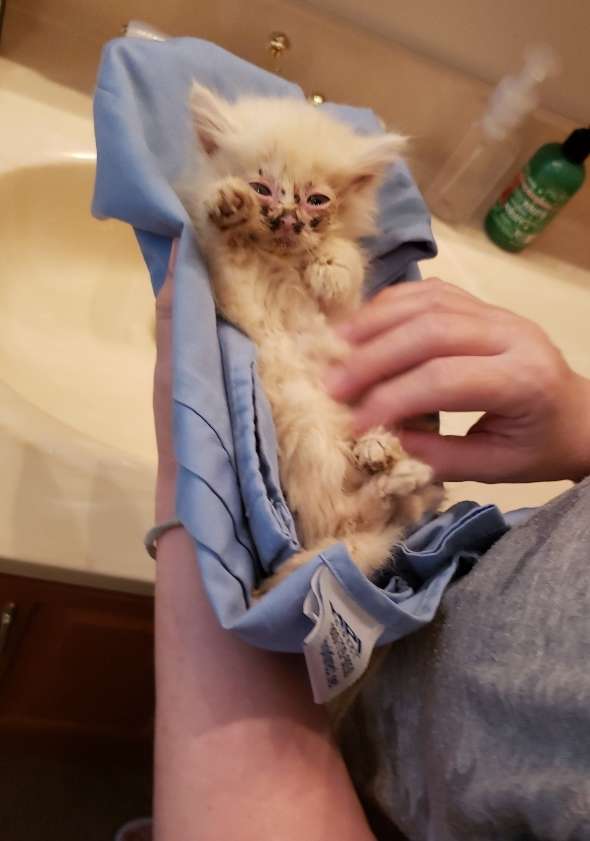 ▼當山姆(Sam Gerth)第一次看到這隻流浪貓時,他和女朋友正在回家的路上,當時 Nimbus 全身都被泥土和油污覆蓋,幾乎已經睜不開眼睛了!