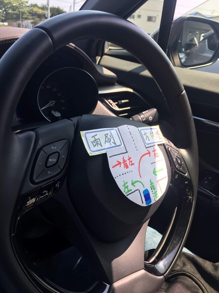 ▼一名網友就分享了自己自製的標示,只見她在方向盤上貼了一張紙,上面清楚寫著雨刷和方向燈的位置、開車時應該靠左、還有在路口時該怎麼看的教學。超專業的方式,讓一時之間搞不清楚的駕駛者也能夠一秒上手!原po也開玩笑的表示,這張圖正在「申請專利中!」