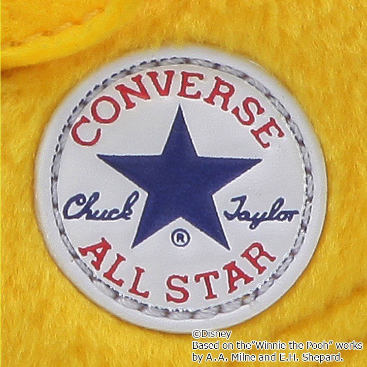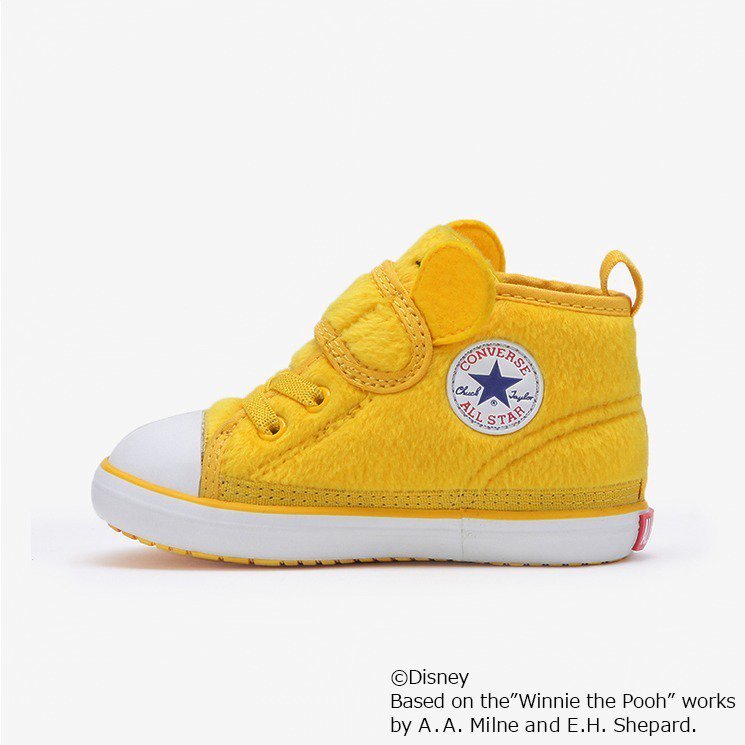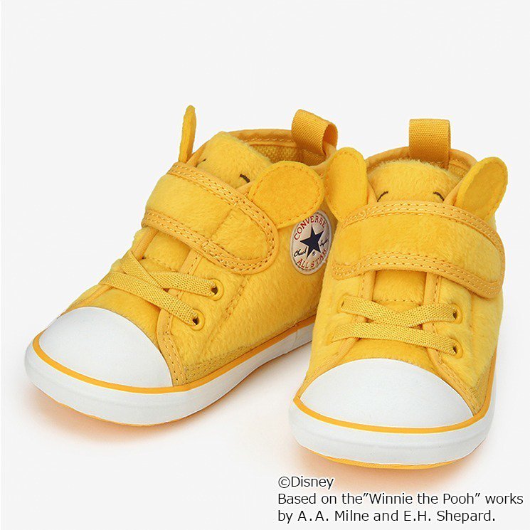 ▼最後一款「BABY ALL STAR N POOH FC V-1」才是大驚喜。這款鞋子整體做成了小熊維尼的代表色,黃色,而且材質毛茸茸的,超級舒服。