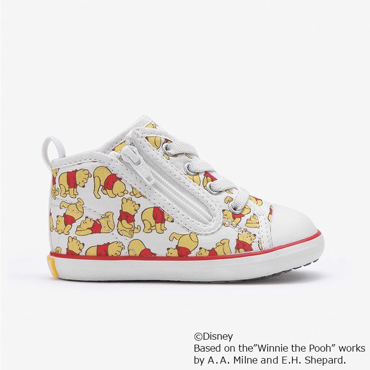 ▼首先來看看為「大小孩」設計的帆布鞋(日碼15-22cm)。這款「CHILD ALL STAR N POOH PT Z HI」採用All Star帆布鞋中經典的配色,白底+紅色線條,非常百搭。