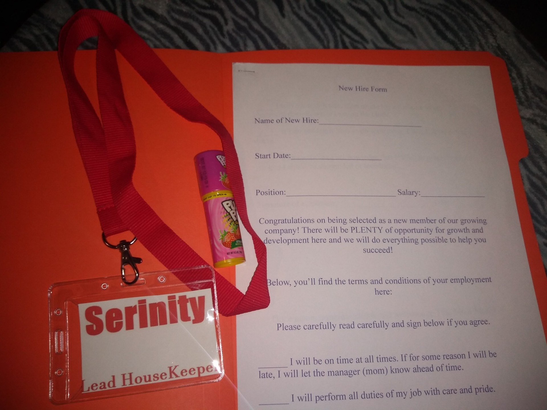 ▼3個孩子有不同的職位,想得到工作必須先填寫應徵表格,上班時還要戴上員工證,就像真正的公司一樣。