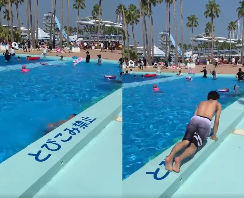 泳池明令不能跳水 男子「乖乖趴下」出奇招:那我安靜入水吧~