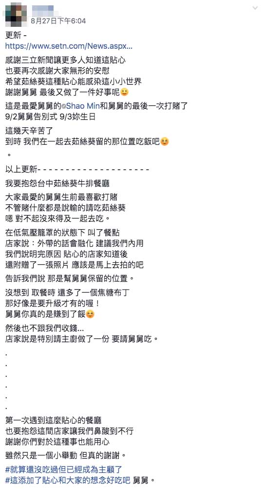 得知客人外帶食物要給「天上的舅舅」 牛排館「幫留座位」暖舉揪感心