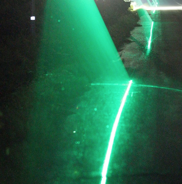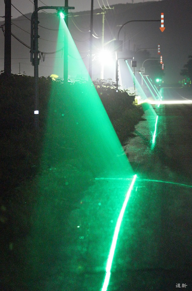 ▼綠色鐳射光長約20公尺,每80公尺的路就會設置6個這樣的街燈,降低開車出錯率。
