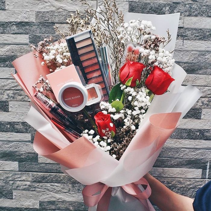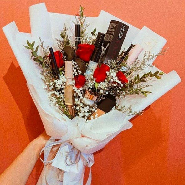 想得出化妝品花束這招實在厲害,兩種美麗的東西結合在一起,女生完全拒絕不了這種浪漫!