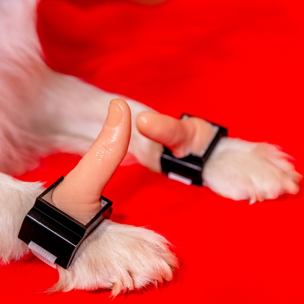 ▼這款手環是很逼真的大拇指造型,狗狗戴上後,前爪靠在一起時,就會出現「拇指碰拇指」的畫面。