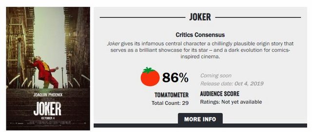 ▼現在《小丑》在IMDb、爛番茄等網站上的評價也很正面,IMDb評分高達9.9、爛番茄新鮮度一度維持在86%。毫無疑問,又一部好電影誕生了。