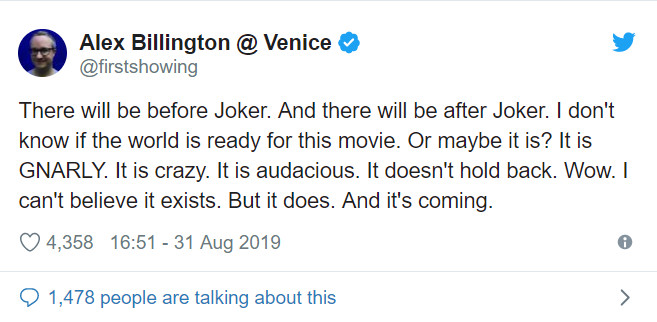 ▼Alex Billington表示:「未來的電影將劃分為《小丑》之前和《小丑》之後。我不知道外界是否已經準備好欣賞這部電影。它太精彩了!它非常大膽,我無法相信它真的存在。但這是真的,它即將到來。」
