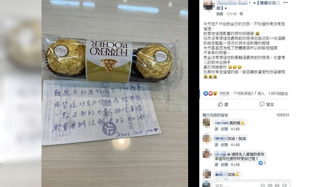 ▼原po在臉書社團中表示,自己近1個月來飽受男友的各種背叛行為,最後兩人還動起手來,自己才會躲到超商裡啜泣。當時有1名年輕女子看到原po這個模樣,默默的將一條金莎巧克力和一張紙條放在桌上後就轉身離開,紙條上的內容寫著:「雖然不知道妳發生了什麼事,但希望這巧克力可以為妳帶來一點正面的力量。相信事情都會有辦法解決的,加油!Jesus love you!」