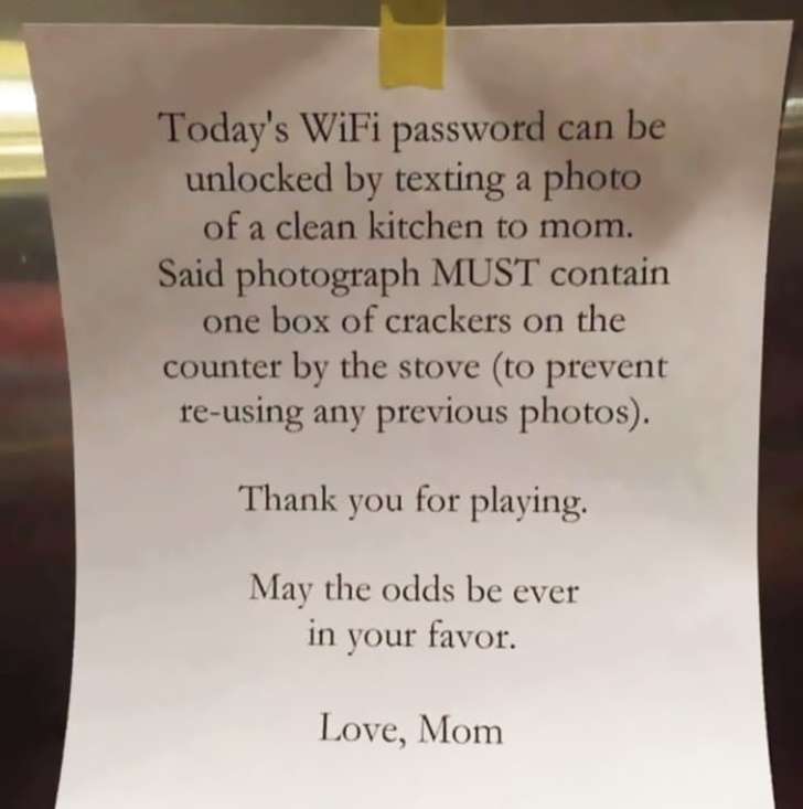 ▼「今天的Wifi密碼必須由這樣的照片解鎖:拍一張清理廚房的照片,照片中必須有一個餅乾盒(以免你使用舊照),加油! -- 愛你的媽媽。」