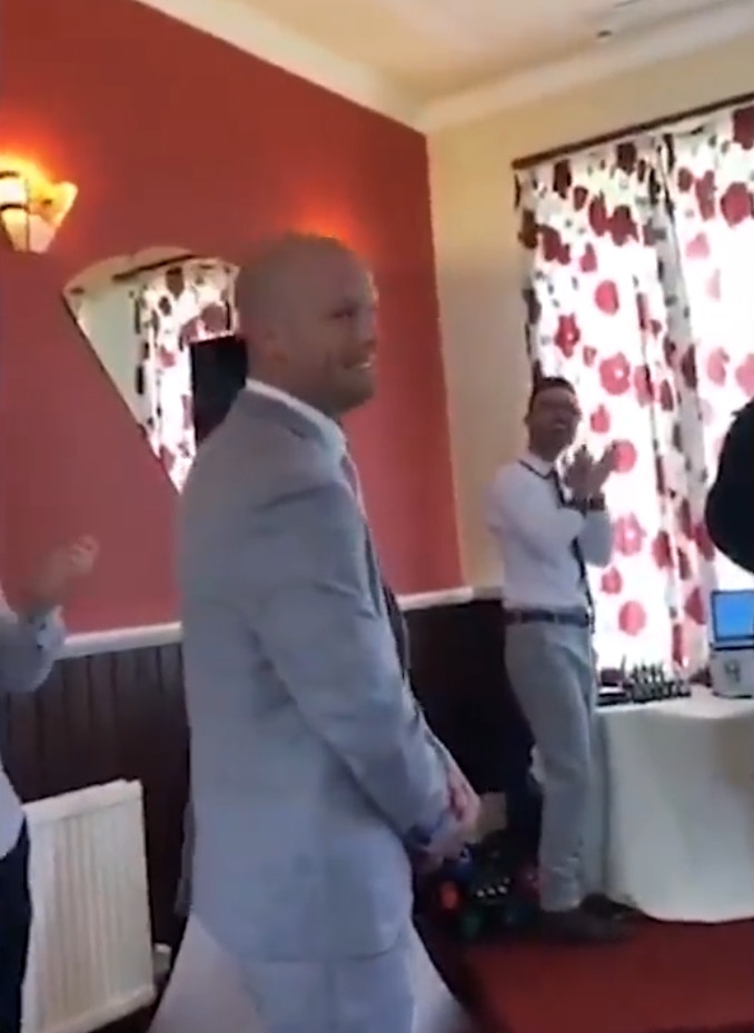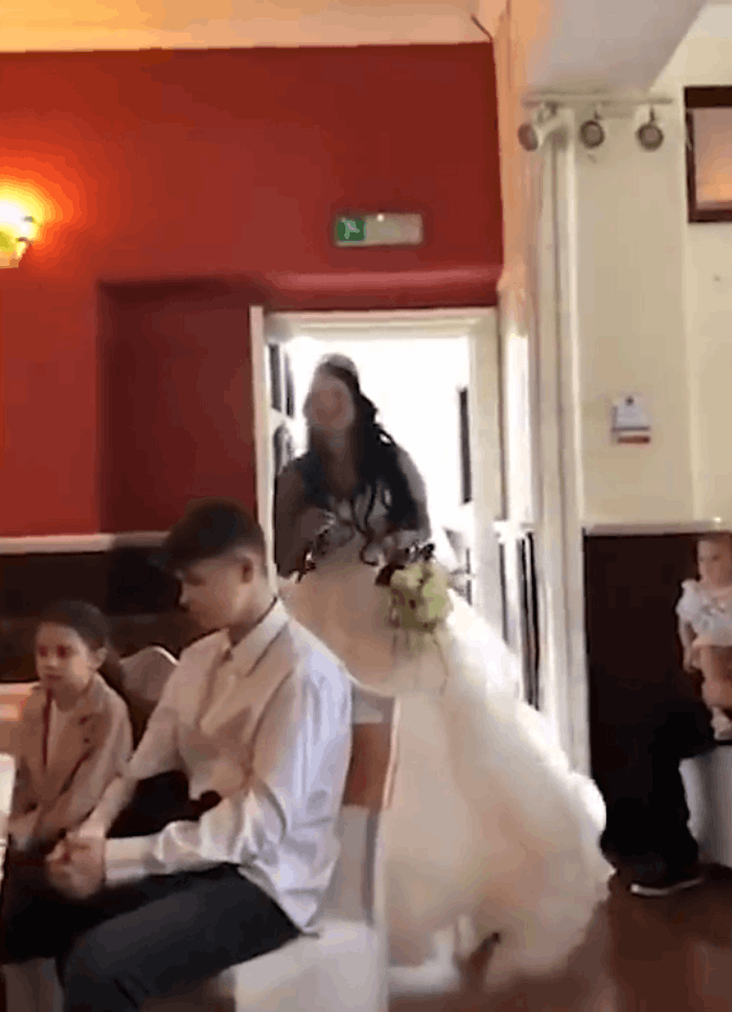 ▼Paul嚇了一跳,但穿著婚紗的Aleasha一邊唱歌一邊走到他面前,還當眾跪下向他求婚。