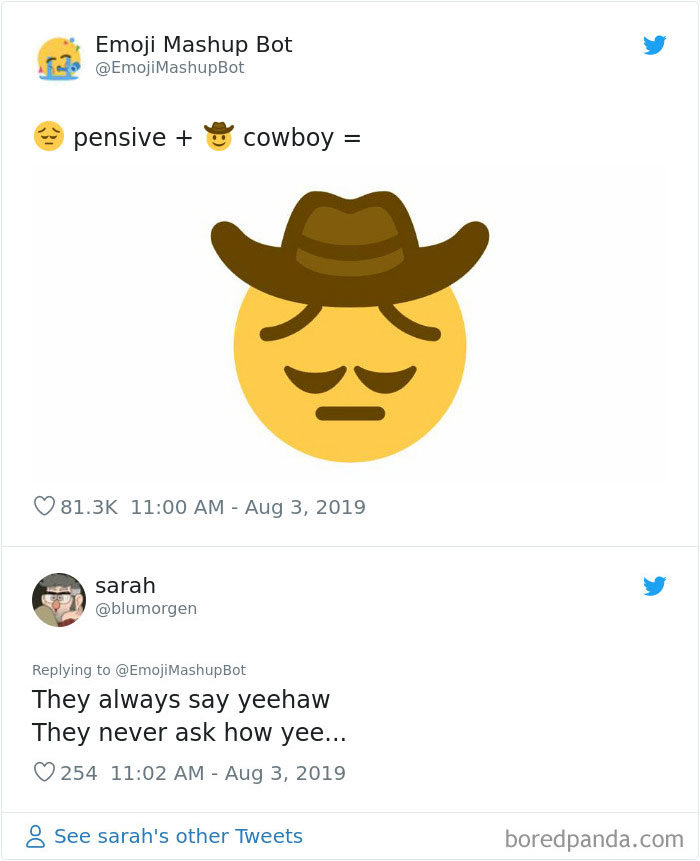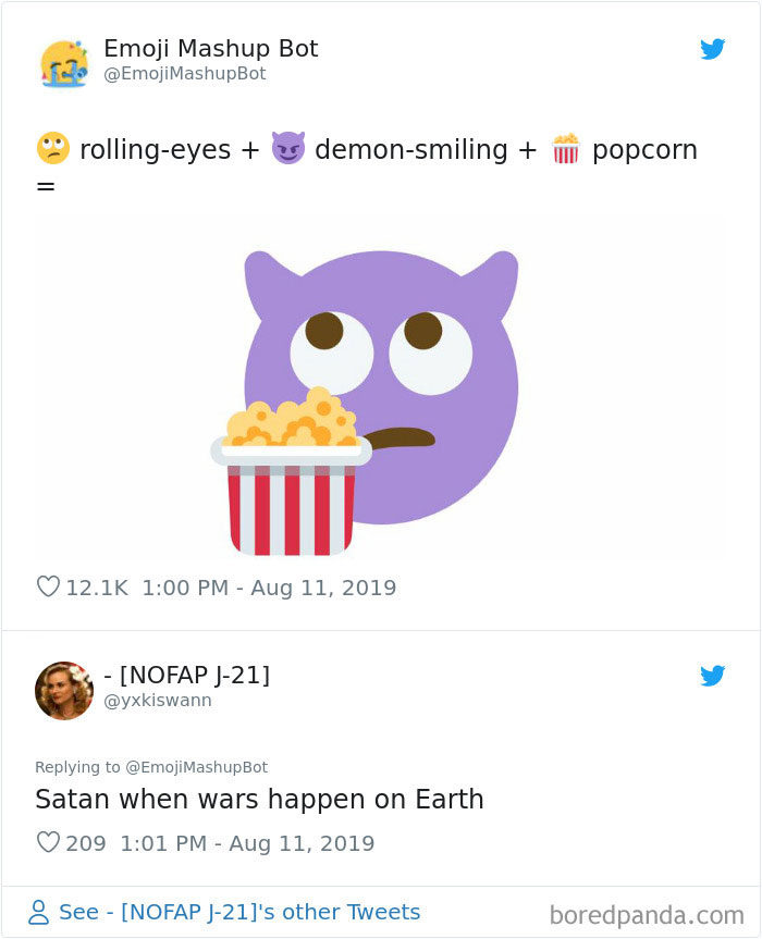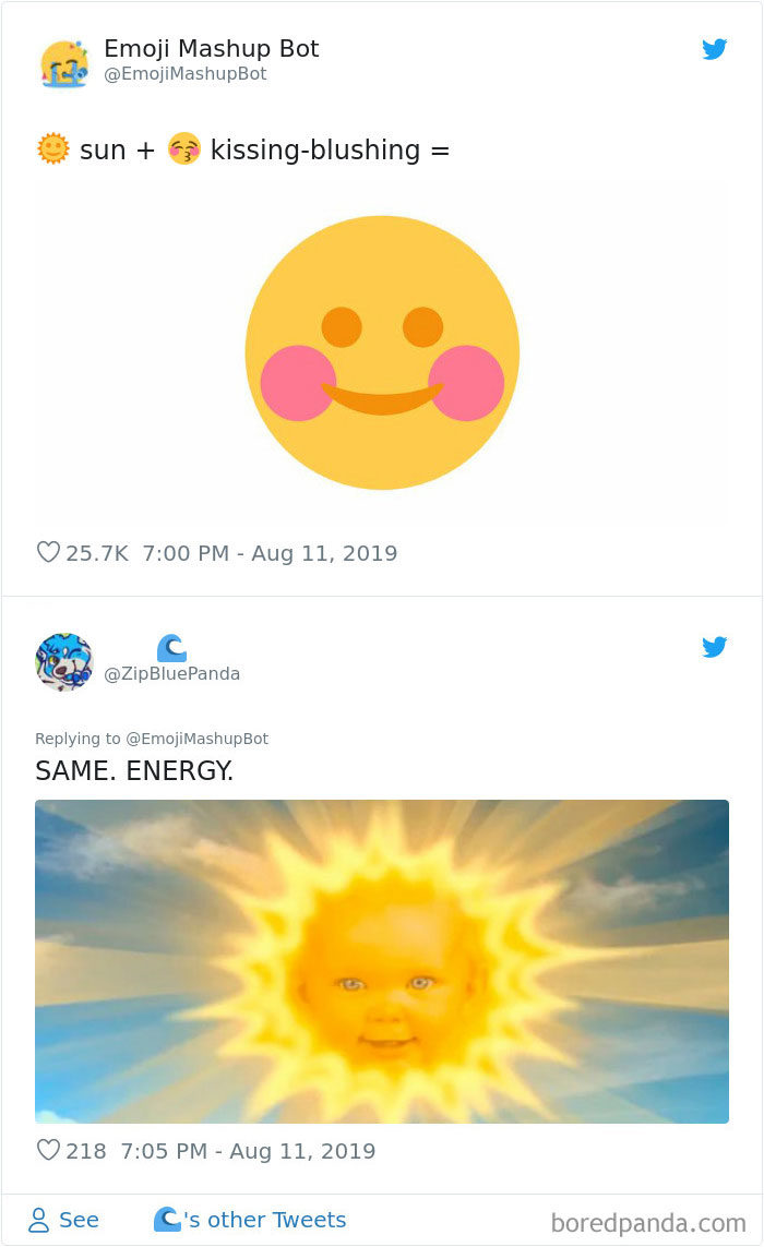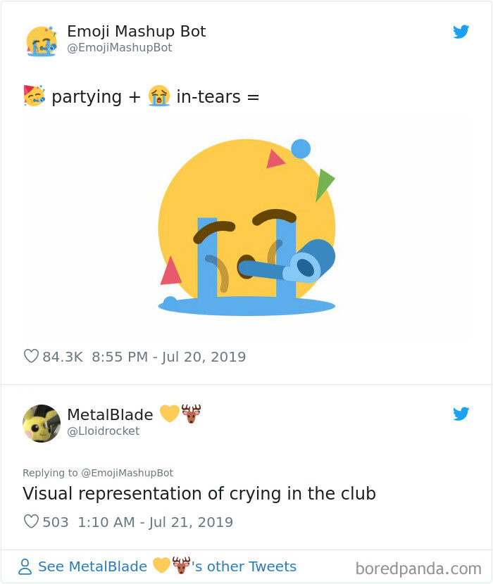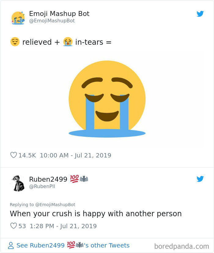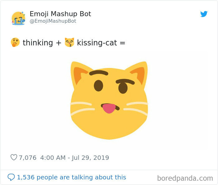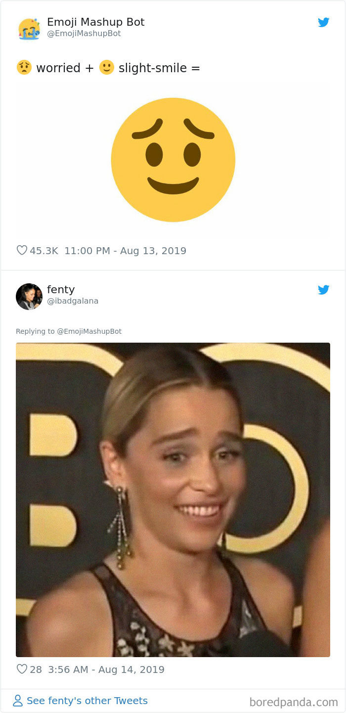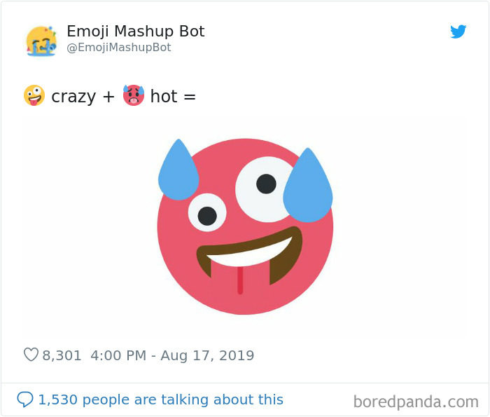 2019年09月11日大家平時聊天愛用表情符號嗎?雖然表情符號能表達很多情緒,但有的時候還是覺得不太夠用,沒辦法準確表達內心的感覺。法國18歲男孩Louan Benmah超天才,他開發了一款名為「The Emoji Mashup Bot」的APP,能將好幾種表情符號混合起來,變成新的。不管你的情緒多複雜,都能用這些表情符號來表達~