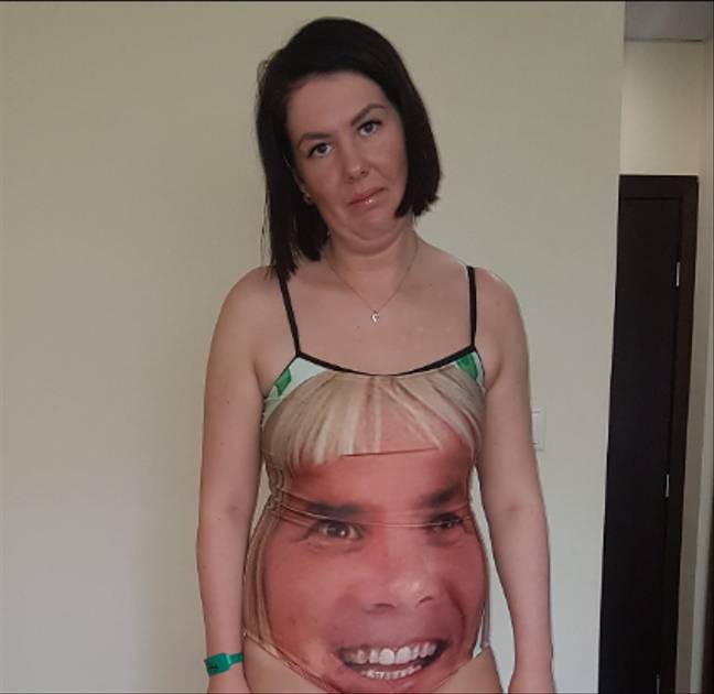 ▼Megan從5歲姪女手中接過爸爸送給自己的禮物時非常開心,但看了一下後簡直不敢相信自己的眼睛。那是一件泳衣,上面印著爸爸大大的臉,超級醒目!爸爸還開玩笑說:「這樣就沒人敢看你啦。」