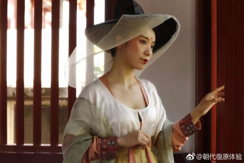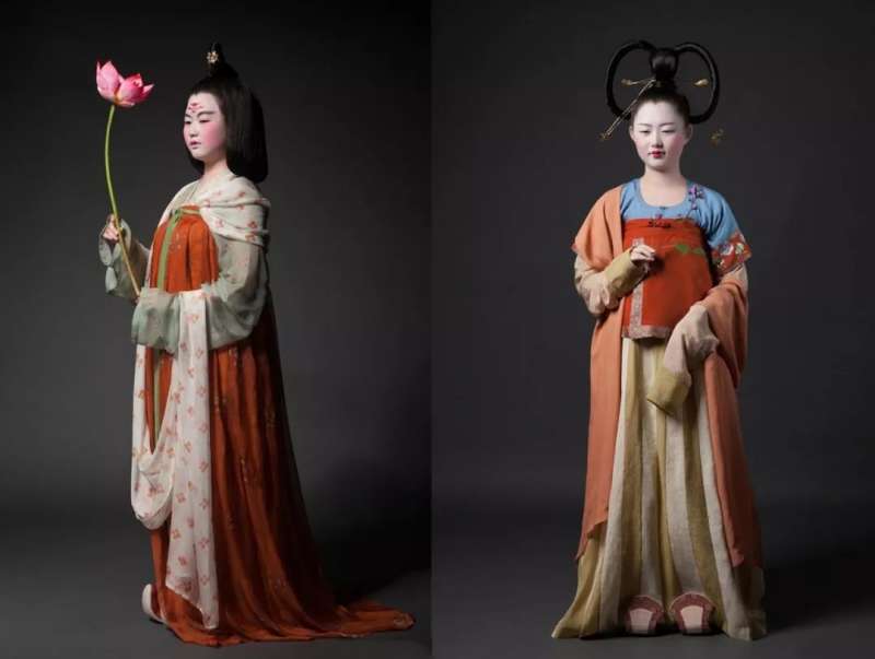 ▼初唐單刀半翻髻,和錦緣半袖襦裙腰裙,是根據龍朔三年(663),新城長公主墓中的壁畫還原的。