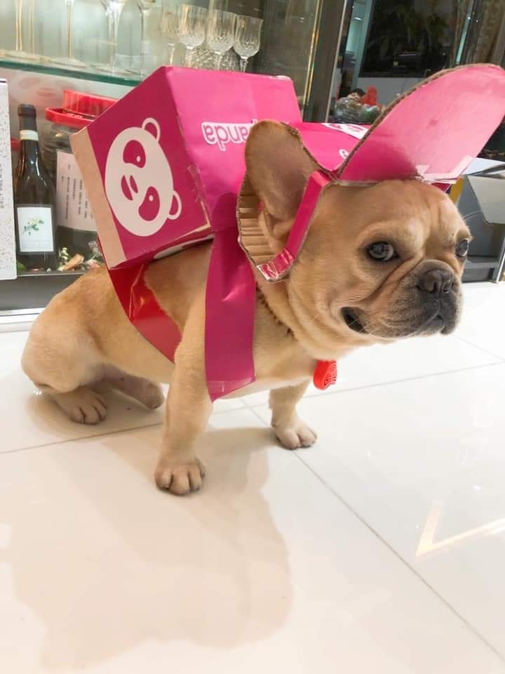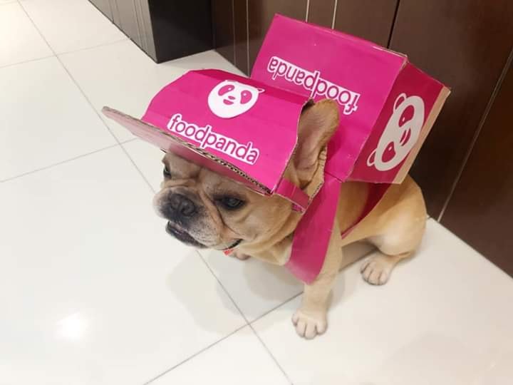 ▼原來這位主人模仿外送平台自製了一個粉紅色的外送箱,還用厚紙板為狗狗做了一頂小帽子,模樣非常呆萌可愛!