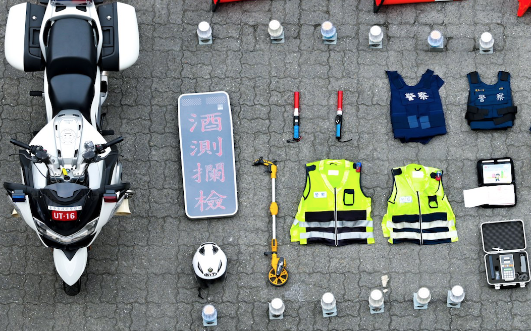 ▼照片裡可以看到的有警車、警用機車、警用背心、警示燈及攜帶式酒測器等工具。