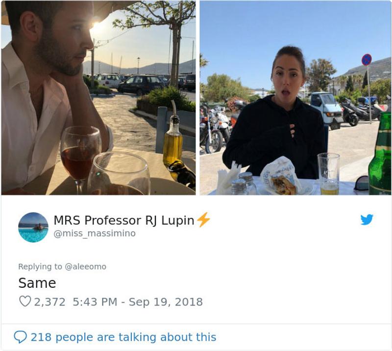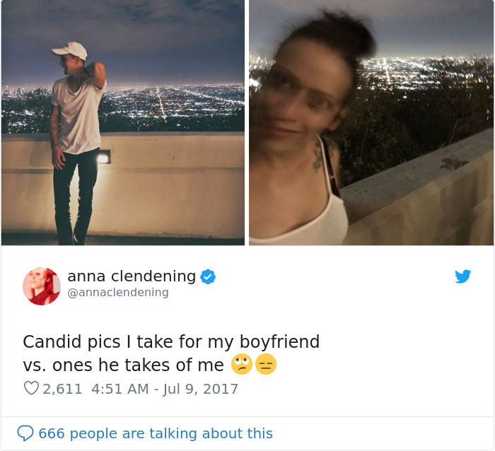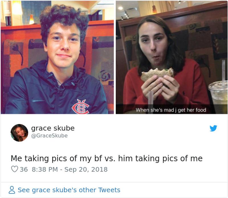 情侶們一起出門吃大餐或旅遊時,總是不免俗的想要拍下照片來記錄這美好的時刻,順便上傳到社群網站向大家放閃一下。不過也因為男女對於拍照的概念似乎有點差距,讓許多女友都直呼男友是「拍美照的庸才,拍醜照的天才」!不久前推特上就吹起了一股「照片對比」的風潮,將女友拍攝男友的照片和男友拍攝女友的照片一起分享出來,讓許多女友都紛紛直呼:「為什麼男友總是可以捕捉到自己最醜的一瞬間呢?」