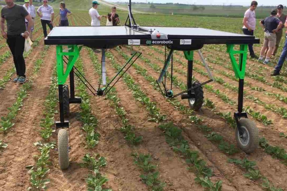 ▼ecoRobotix 的機器人搭載了 GPS、感測器等裝置,能夠在農田中自由穿梭而不會壓到農作物,也能夠精準的辨識出雜草和農作物。機器人無需人為操作,擁有自主運作的功能,也能透過太陽能面板解決充電問題,不僅可以連續工作12小時不休息,也可以透過手機 APP 為機器人進行調整。