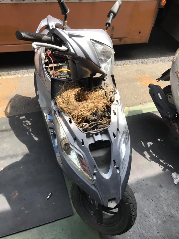 機車放置太久沒有使用,很容易就會發生一些意想不到的狀況,像是無法發動、油門不順暢等等問題,但日前有位網友在臉書社團中分享了幾張令人傻眼的照片,原來這輛機車因為放置得太久,竟然被鳥兒在裡面築巢了!