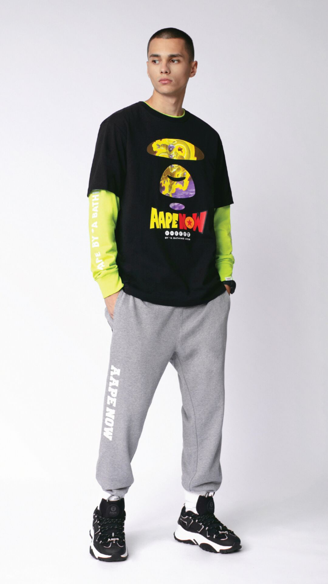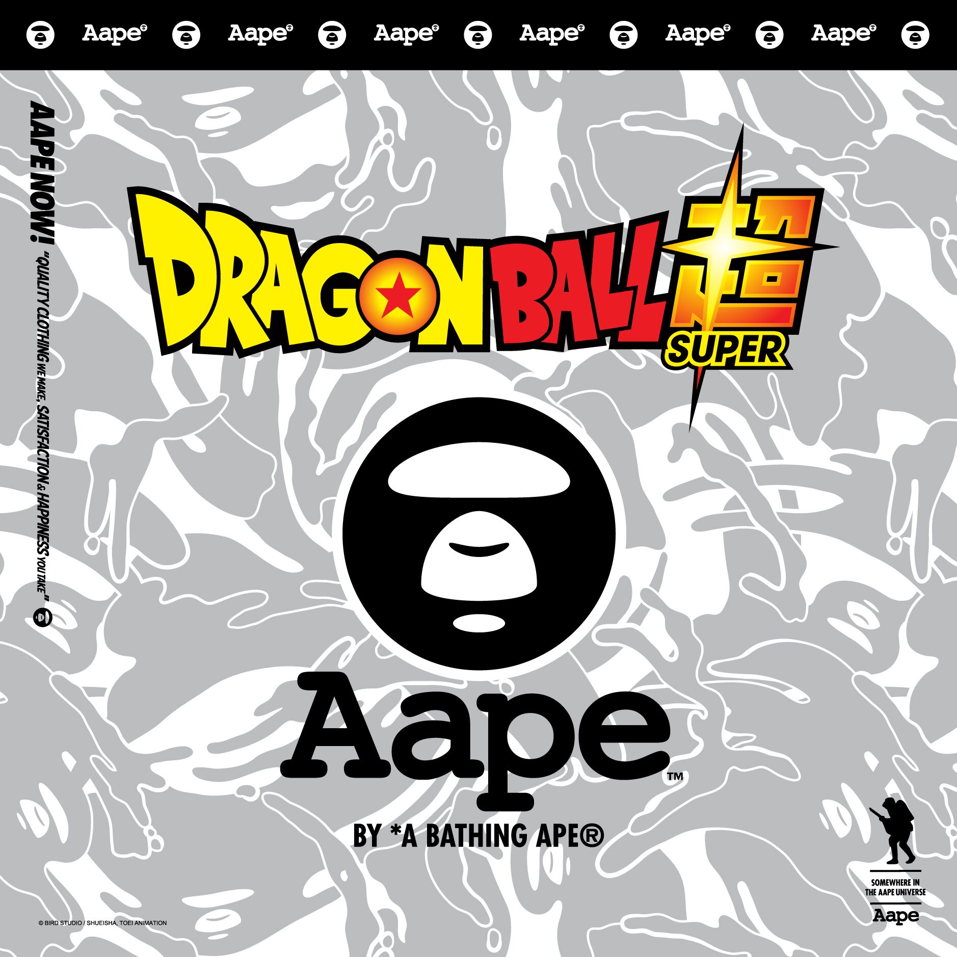 ▼AAPE BY *A BATHING APE® x DRAGON BALL SUPER聯乘系列全新聯乘系列以黑色為主調,設計元素圍繞動畫中的靈魂角色悟空、弗利沙、達爾特及比古洛。AAPE經典迷彩和MOON FACE圖案更與劇中人物髮色造型相融,而「AAPE NOW」slogan中亦蘊藏「龍珠」細節,盡顯設計心思。