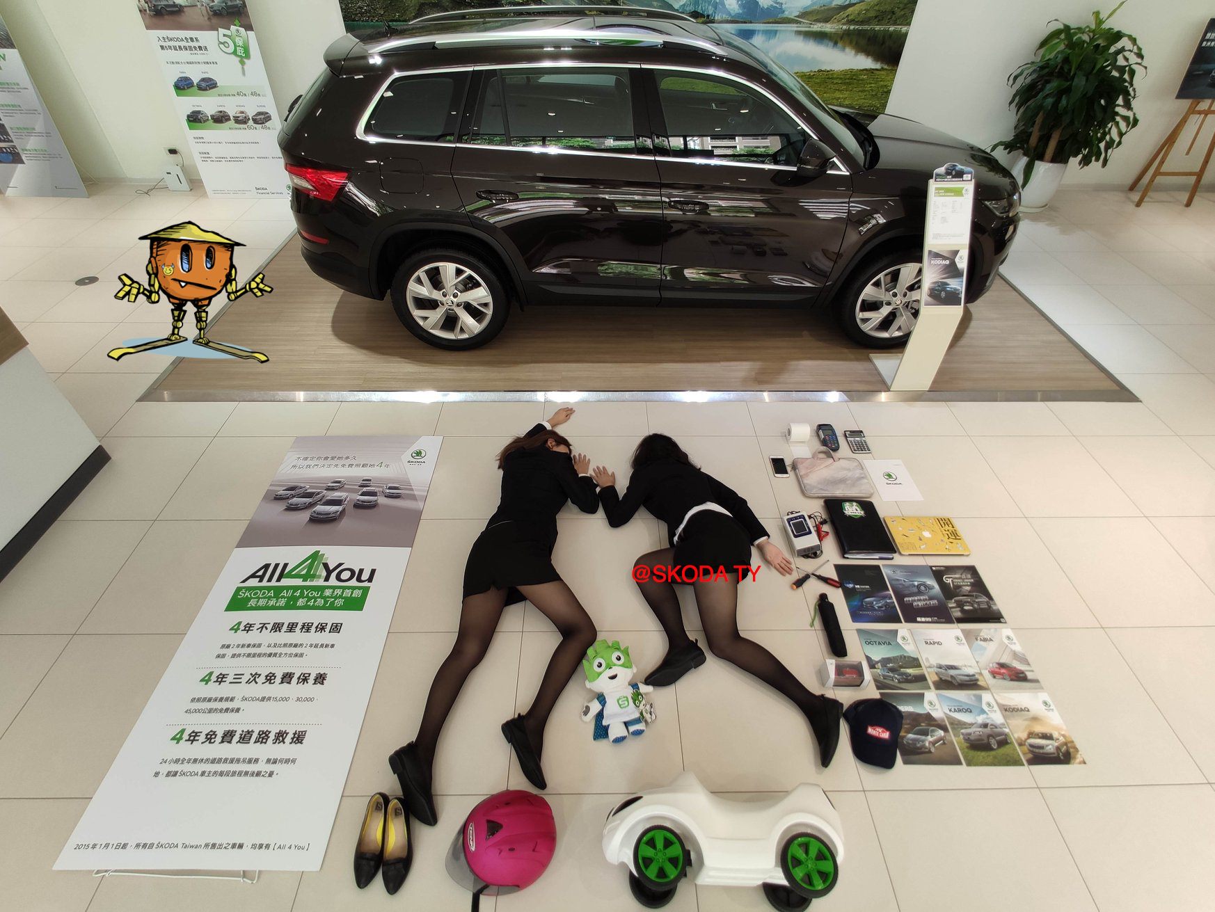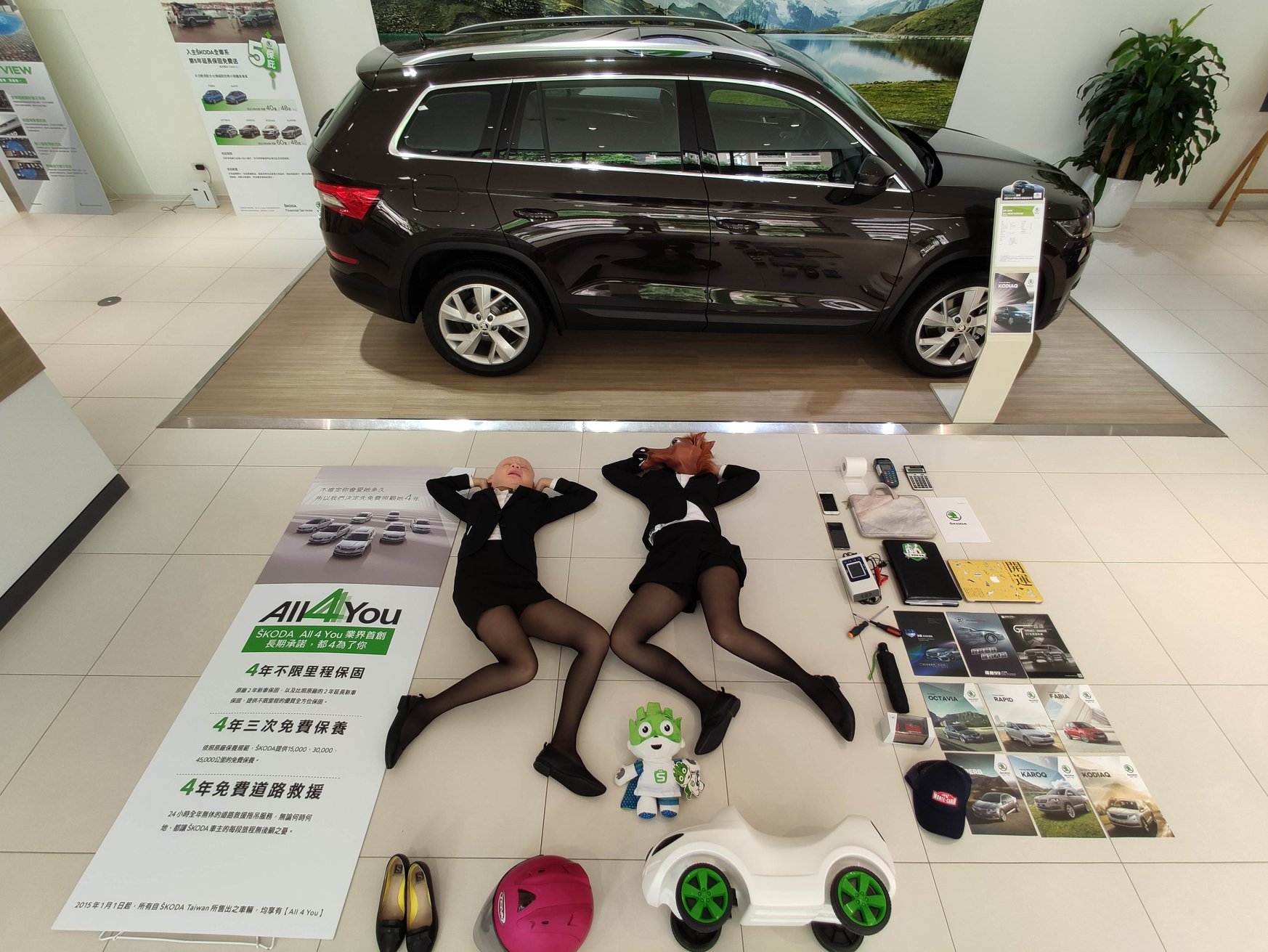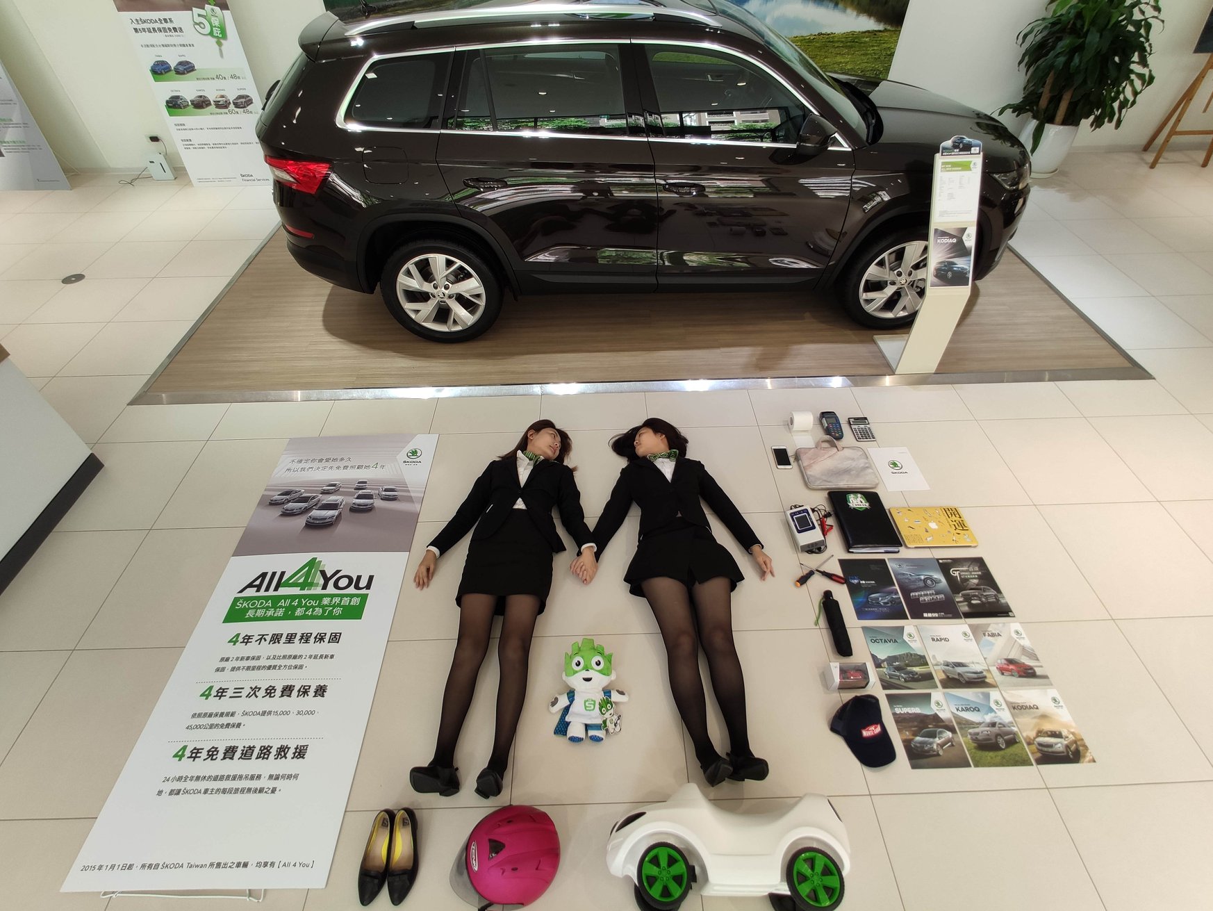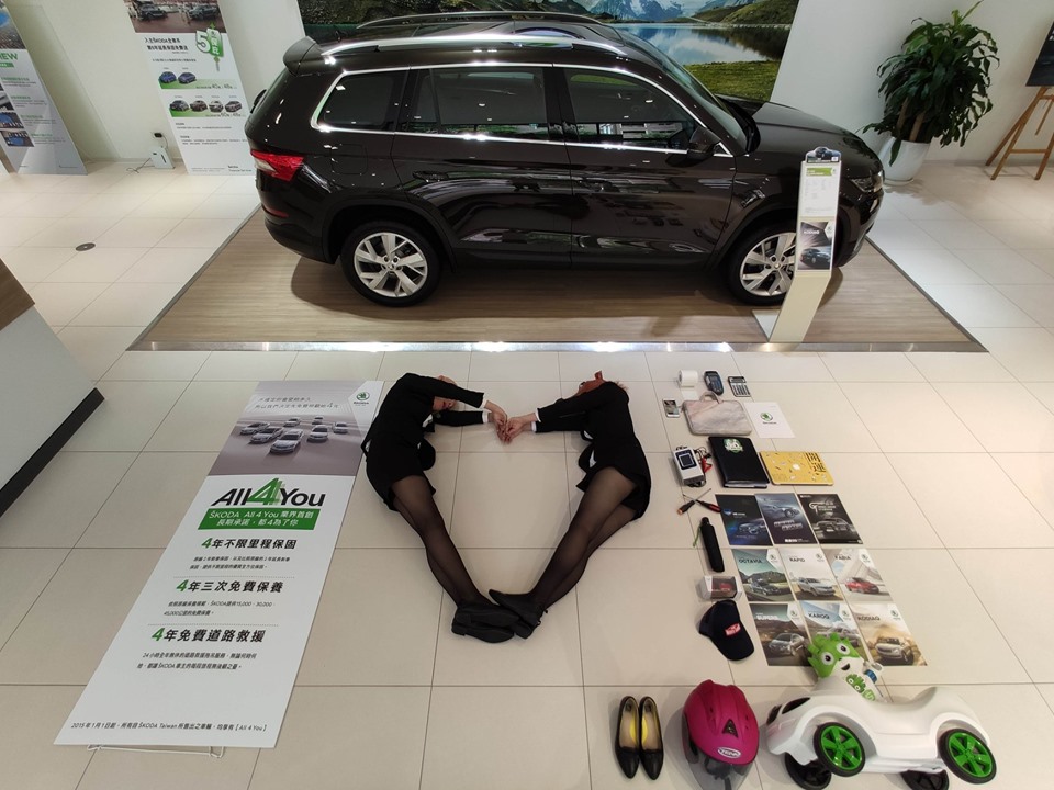▼Skoda榮陞汽車在臉書專頁分享:「銷售顧問究竟應該有哪些裝備?!開箱囉~」並標注「#聰明的就懂、業務的日常」,畫面裡可以看到兩位長腿銷售顧問擺出各種Pose,旁邊則放著汽車資料。