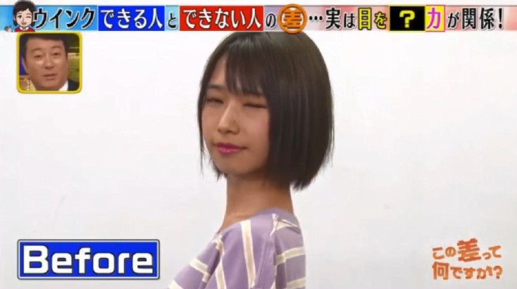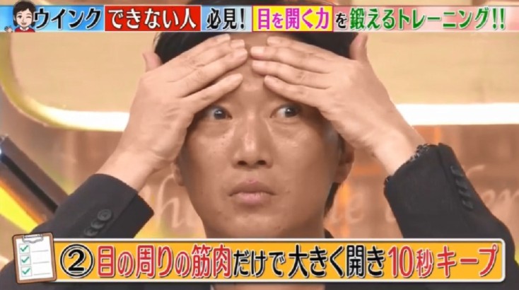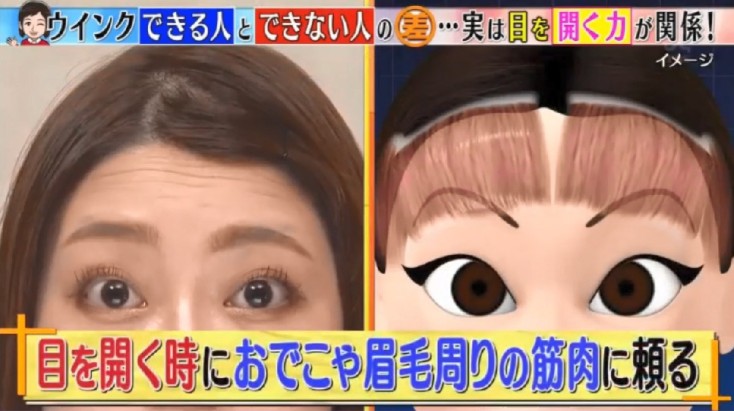 ▼節目也找來了臉部肌肉專家間間田老師來進行講解,她表示無法閉上單邊眼睛是因為眼瞼肌鍛煉不足的緣故。因為在「眨單眼」時,關鍵並不在如何閉上一邊的眼睛,而是如何在雙眼閉合時將其中一隻眼睛睜開!她也表示自己9年前雙眼非常無神,不過經過持續多年的眼瞼肌訓練後,如今眼睛不僅變得更大,看起來也炯炯有神!