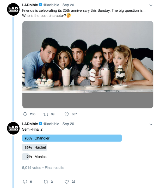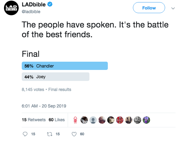 2019年09月24日1994年開播的超級經典美劇《六人行(Friends)》已經25歲啦!外國網站也趁機在推特發起票選活動,讓網友們可以選出自己認為是最棒的角色!經過好幾輪的票選後,最後獲得最多人認同的最佳角色是錢德賓(Chandler Bing)!
