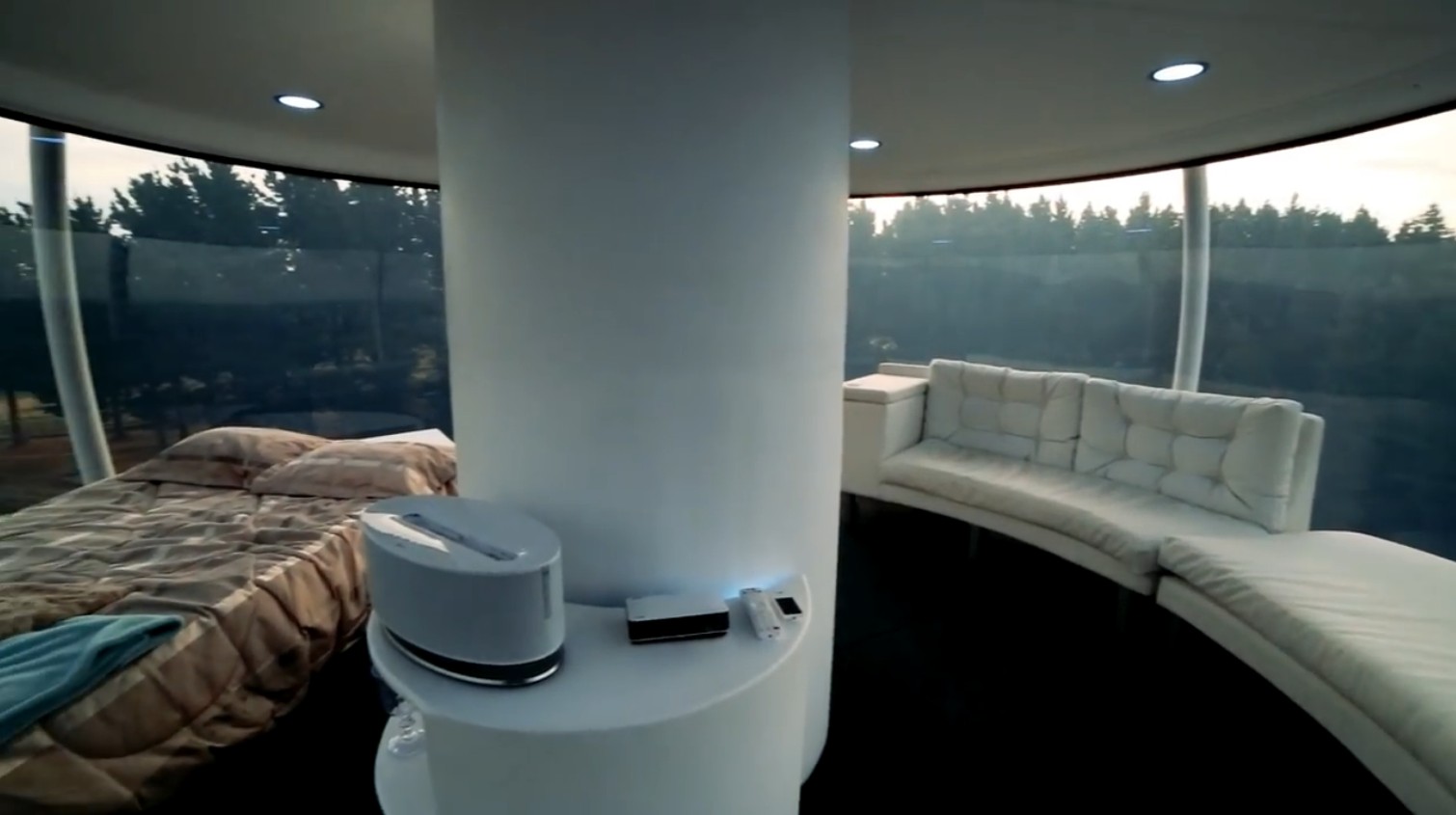 ▼這棟離地建築的外形充滿了未來感,上端的居住空間是由一根粗大的鐵條所支撐的,而建築周圍的360度玻璃都是鋼化玻璃。