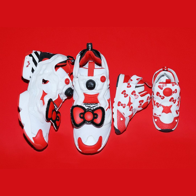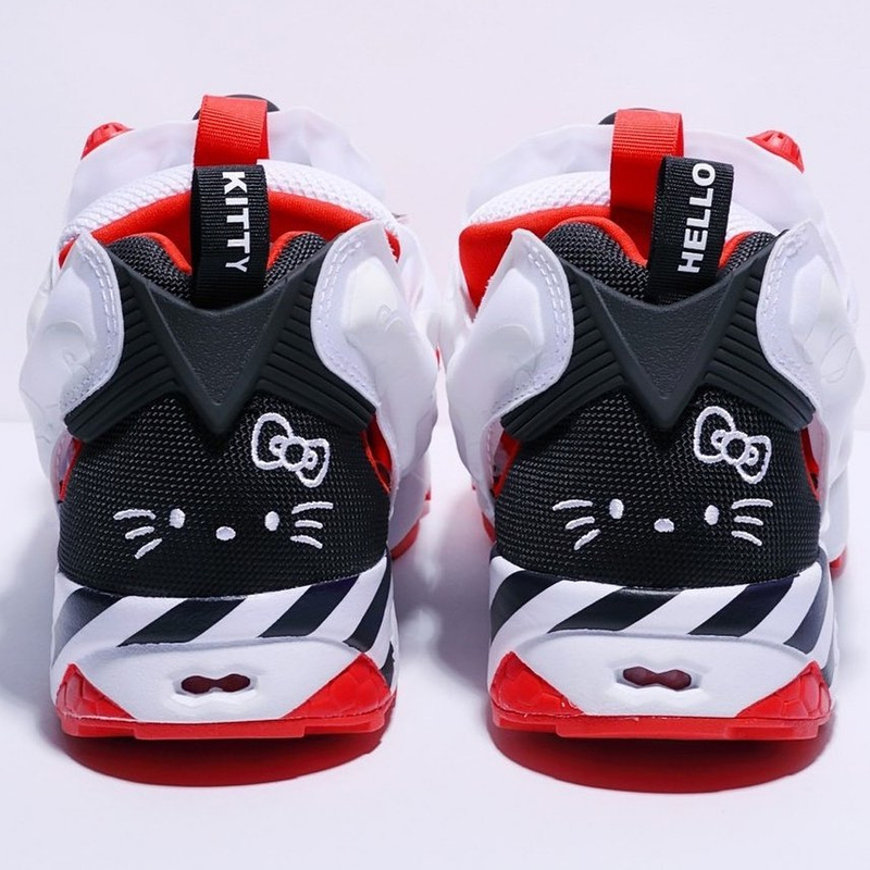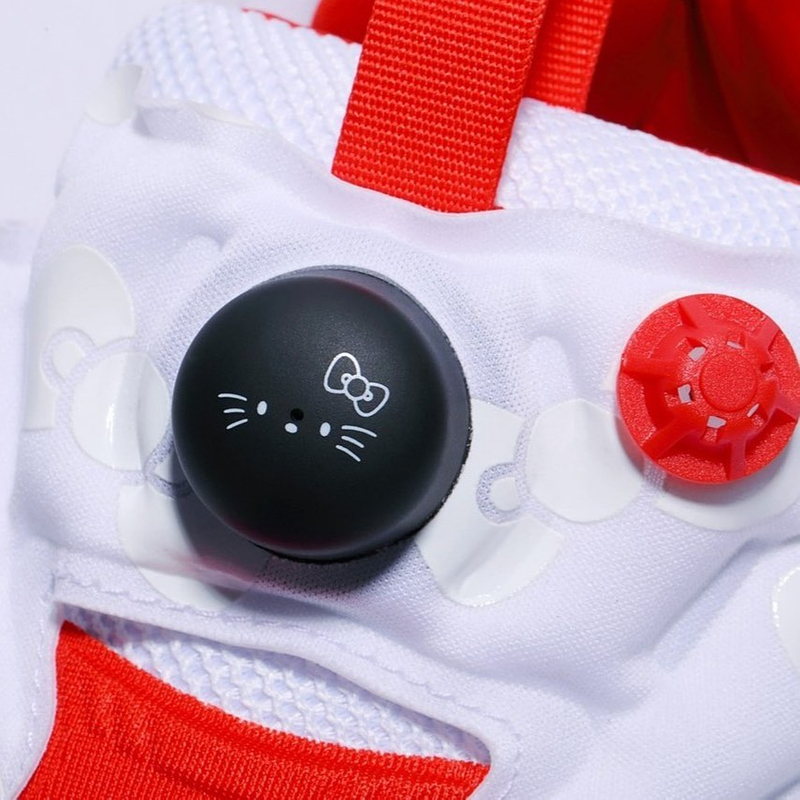 ▼這款Reebok Instapump Fury x Hello Kitty聯名鞋款以白色和紅色為主,鞋面、前側充氣鈕,還有後跟的位置都有Hello Kitty標誌。