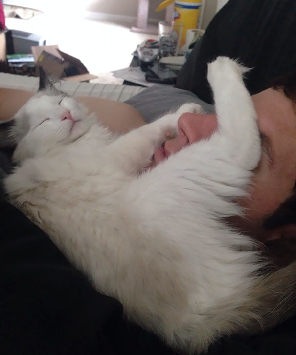 ▼無論我老公在哪裡睡覺,我家貓都會跑過去跟他一起睡。