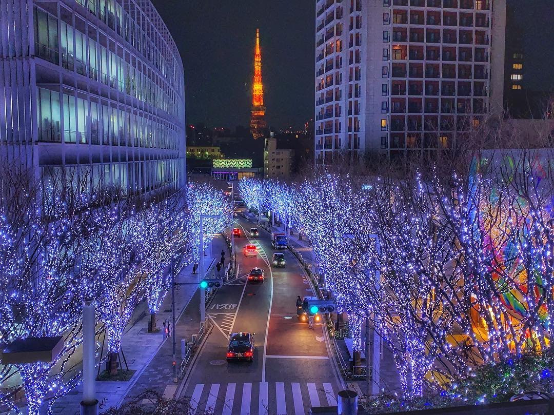 這裡是每年東京最熱門的賞燈景點之一,全長約400公尺的街道都被約70萬顆藍白燈飾點綴,讓人仿佛置身於銀河當中,還可以拍得到東京鐵塔!