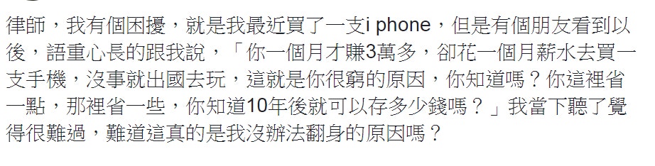 ▼然而,你又知道有多少人是真的靠自己的實力買下它的嗎?許多人只是為了一時的虛榮感,居然想也不想就把錢花出去。下面這位網友就是其中一位,他的朋友看了這樣的行為也忍不住苦勸,希望他不要再這樣了。他聽到對方的話後,終於開始認真思考,還詢問了呂律師的意見。